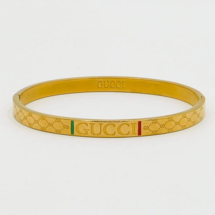 Crafted with a sleek metallic finish, it features signature GG engravings and bold green-red enamel accents, embodying luxury and elegance.
